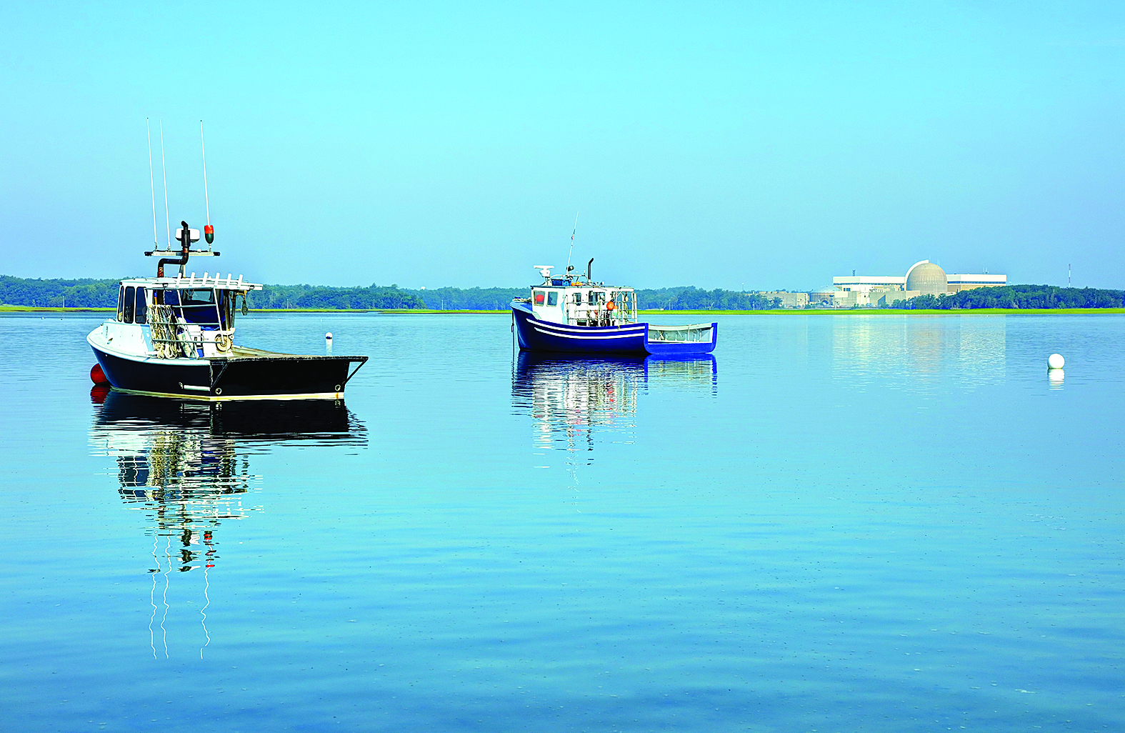 Lobster boats sit at anchor off the coast of the Seabrook Nuclear Power Station, whose owner is among those eyeing a new state law aimed at helping develop AI data centers. iStock photo